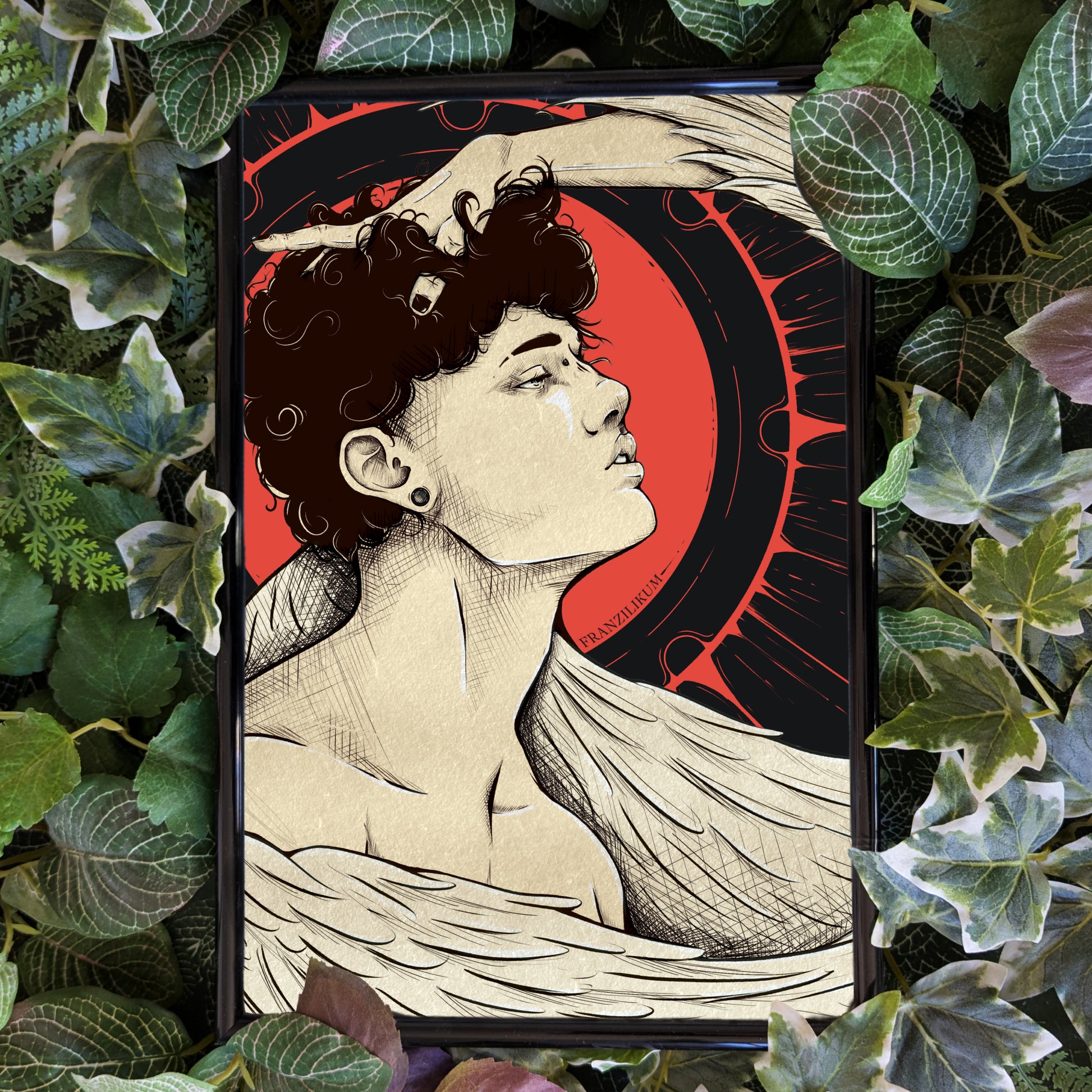 Ein Engel der sehnsüchtig nach oben blickt. Ich bin kein religiöser Mensch, liebe aber die Darstellung von Engeln und Ikonen in Kirchen und religiöser Kunst, auch außerhalb vom Christentum. Figuren mit Heiligenschein haben immer etwas göttliches, übermenschliches an sich. Umso interessanter finde ich es damit zu spielen. Das Motiv findet sich in vielen meiner Bilder wieder. Entweder um alltäglich Figuren in einen göttlichen Status zu erheben, oder um den Verlust von Macht zu zeigen - wie in diesem Bild.