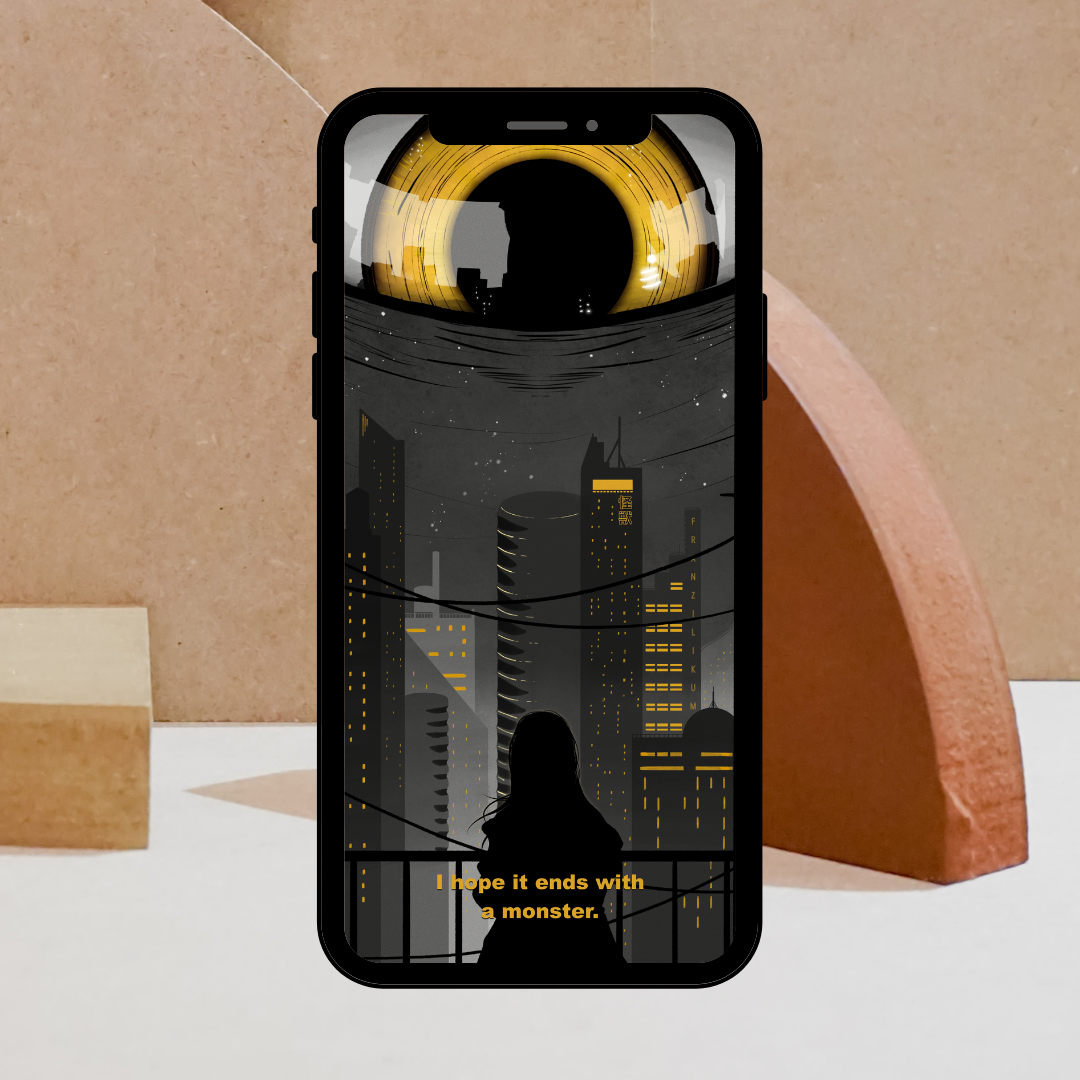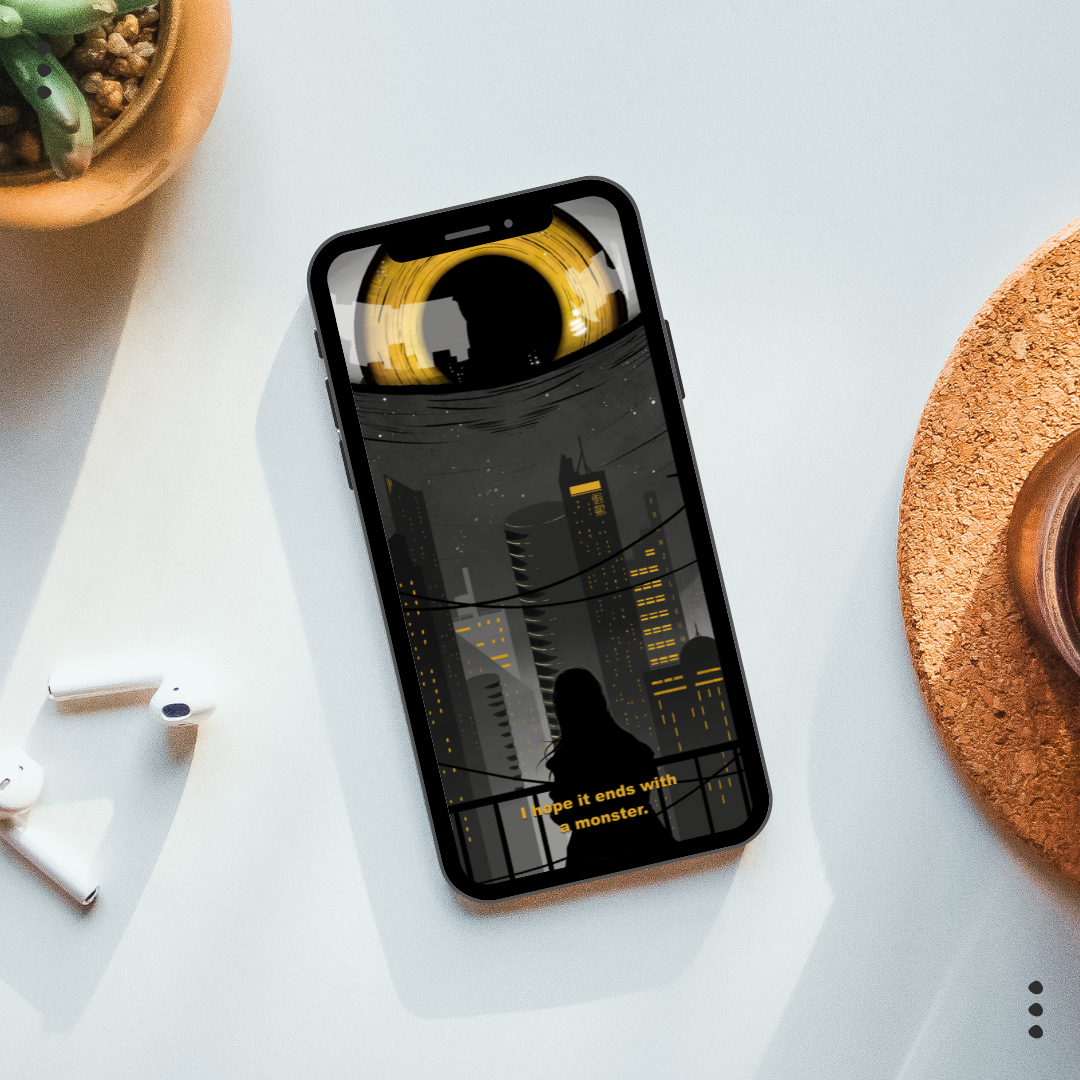 Das melancholische Wallpaper "I hope it ends with a monster" kommt in 3 mobile Größen und als Desktop Wallpaper. So kannst du jedes deiner Geräte ganz individuell mit Kunst verschönern!